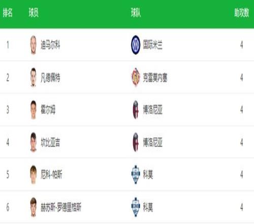 此外,他還以4次助攻與迪馬爾科、凡德佩特、霍爾姆、坎比亞吉以及隊友赫蘇斯-羅德里格斯并列意甲助攻榜榜首。