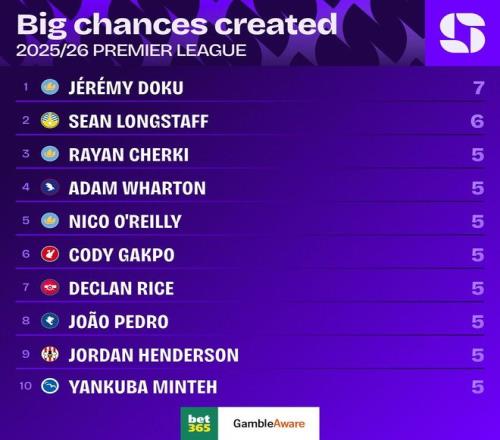 Squawka統(tǒng)計本賽季至今英超創(chuàng)造絕佳機會TOP10: