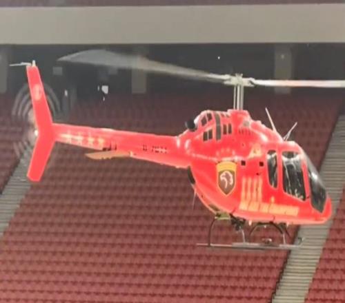 慶典最激動(dòng)人心的時(shí)刻出現(xiàn)在直升機(jī)送火神杯環(huán)節(jié)。從視頻中看到,一架直升機(jī)突然盤旋在現(xiàn)場的上空,然后徐徐降落在現(xiàn)場中央。