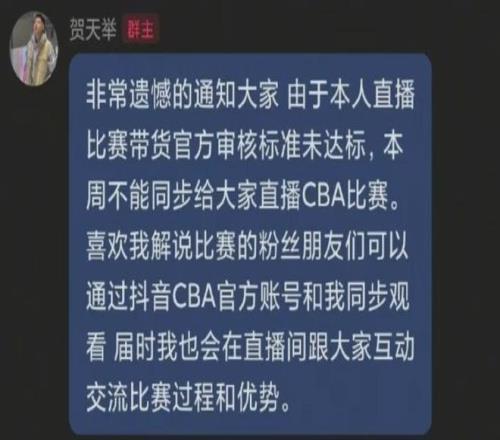 舉個最簡單的例子,昨晚遼籃名宿賀天舉在自己的粉絲群里說,因為他在轉(zhuǎn)播時的帶貨銷量不達標,暫時失去了個人抖音賬號直播CBA比賽的資格。