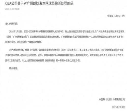 為嚴(yán)肅聯(lián)賽紀(jì)律,根據(jù)《中國男子籃球職業(yè)聯(lián)賽紀(jì)律準(zhǔn)則》第二章第二十四條規(guī)定,對徐昕處以罰款2萬元的處罰。此外,依照本賽季CBA聯(lián)賽賽風(fēng)賽紀(jì)責(zé)任人制度相關(guān)規(guī)定,對廣州男籃俱樂部負(fù)責(zé)人何振軒處以罰款1萬元的處罰。