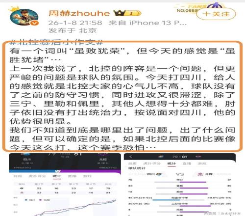 賽后,媒體人周赫zhouhe在社媒發(fā)文,點評了本場比賽。“有一個詞叫“雖敗猶榮”,但今天的感覺是“雖勝猶堵”…上一次我說了,北控的陣容是一個問題,但更嚴峻的問題是球隊的氛圍。今天打四川,給人的感覺就是北控大家的心氣兒不高,球隊沒有了之前的防守習(xí)慣,同時進攻又很滯澀……按說面對四川,他的優(yōu)勢很明顯?!?。
